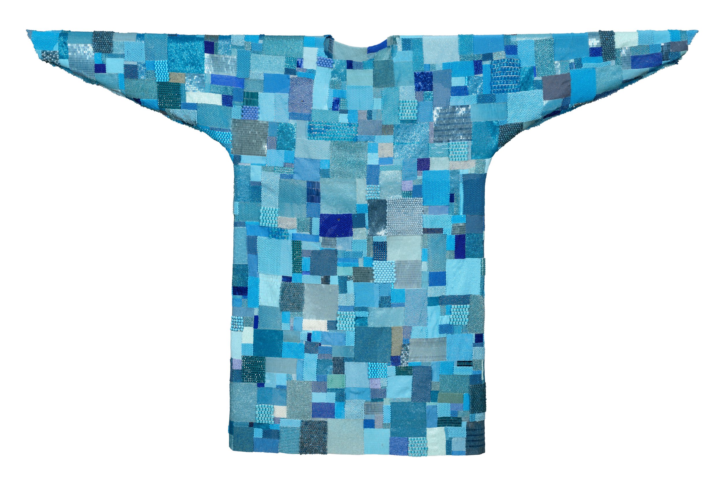 Thompson invited individuals affected by addiction within their families and communities to participate in transforming a ubiquitous blue hospital gown into a fully beaded garment. The artist and her studio team offered brick stitch lessons using a wide range of bead sizes to ensure accessibility across age and skill levels, resulting in unique patches of varying rectilinear shapes.